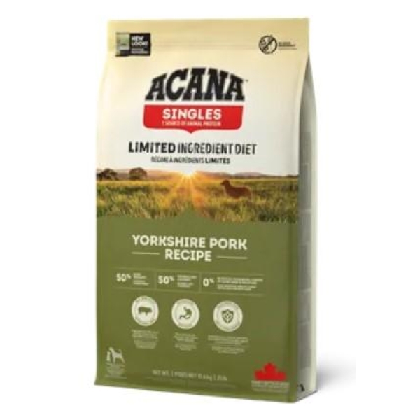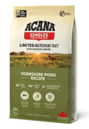 Acana Yorkshire Pork er kornfri og har et begrenset antall ingredienser. Animalske proteiner i produktet er frittgående gris. Forholdet mellom kjøtt, lever og nyre reflekterer hundens naturlige diett og eliminerer behovet for syntetiske tilsetningsstoffer. Inneholder også frysetørket lever som gir god smak. Eple, squash og gresskar blir en rik kilde til løselige fibre som er gode for følsomme mager. Fôret er inkludert i Acanas Singles-serien, som bare inneholder én kilde protein.