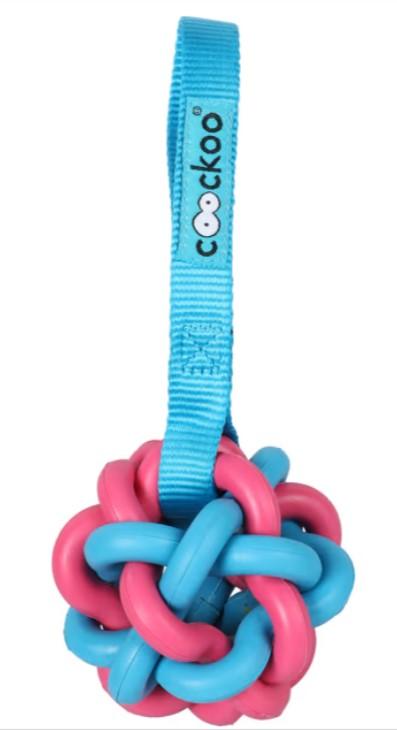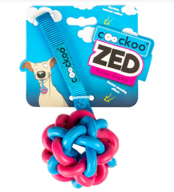 Den fargerike Coockoo Zed-hundeleken består av seks like store gummiringer som er vevd sammen for å lage en blå og rosa ball. Den vevde snoren kan brukes til å kaste ballen, holde den under lek eller for hunden din å tygge på. Zed vil garantert gi hunden din mange timer med lek og tyggeglede, og hjelper også med å ta vare på hundens tenner.