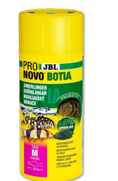 Mattabletter for alle loaches fra 1-20 cm. Ideell hovedmat for alle loaches (Botia-arter, sugende loaches, hillstram loaches, Pangio-arter). Bruk: La den enten synke til bunnen av akvariet eller fest den til akvarieglasset med lett trykk fra innsiden. Naturlige råvarer uten kunstige tilsetningsstoffer for et naturlig kosthold og sunn akvariefisk. Testet på JBL-forskningsekspedisjoner i tropene. Svært høy aksept selv med kresne arter takket være råvarer av høy kvalitet som laks, spirulina og reker. Pakkens innhold: original forseglet, luft- og lysttett, resirkulerbar boks med doseringshjelp inne i lokket (for 100 ml, 250 ml, 1000 ml)