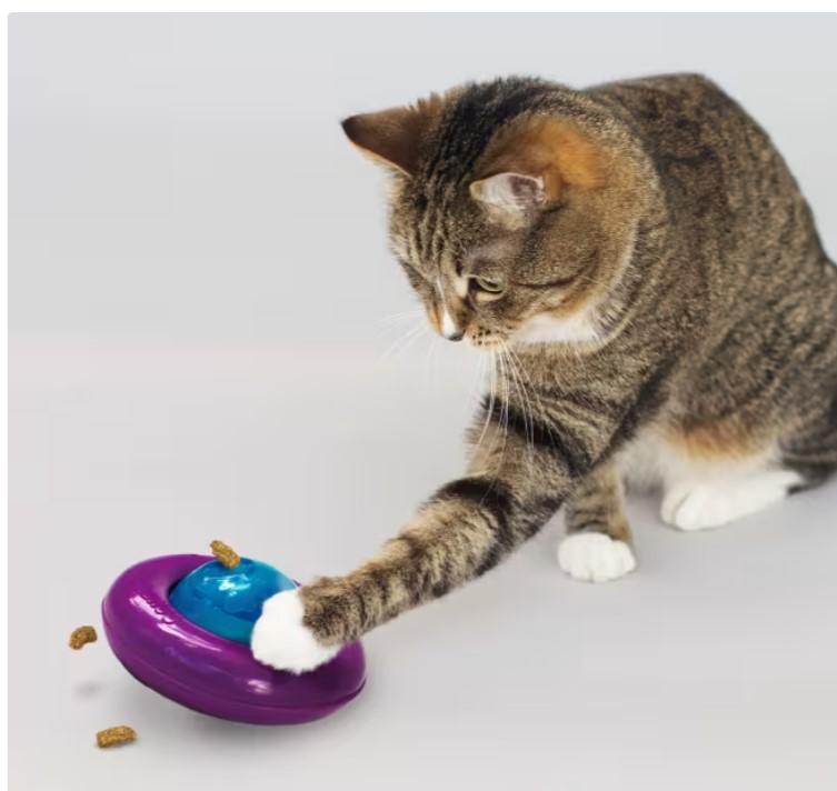 KONG Cat Gyro er den ideelle mat- og godbitdispenseren som har en rulle- og snurreaksjon som engasjerer katter i et mentalt stimulerende matpuslespill. Infundert med potent KONG North American Premium kattemynteolje, har den også en bjelle i den ytre ringen som begge kombineres for å forlenge lekeøktene. Den avtakbare midtbeholderen er enkel å fylle og rengjøre. Rommer 1/3 kopp mat, noe som gjør den til en ideell erstatning for bolle.