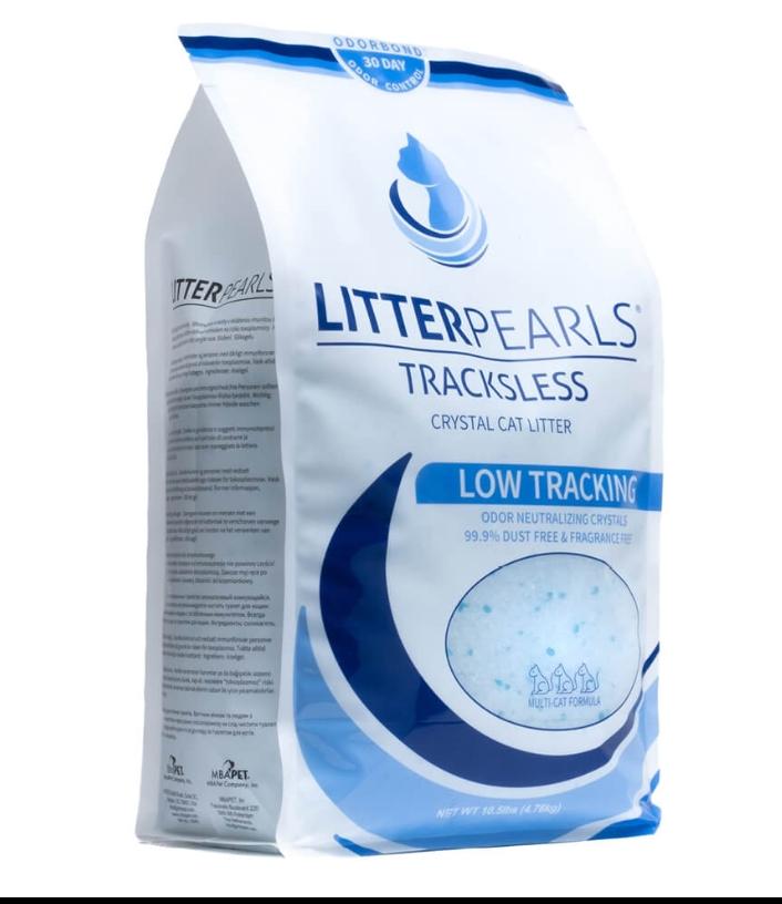 Litter Pearls Tracksless er et 100% naturlig produkt. Den gir effektiv odørkontroll, absorberer væske umiddelbart og krystallene gjør at det etterlater seg mindre spor utenfor kattetoalettet.